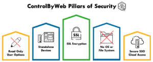 Kaikki ControlByWeb-laitteet tukevat HTTPS:ää ja käyttävät sisäänrakennettuja verkkopalvelimia, jotka vaativat todennusta ja tukevat käyttäjätason käyttöoikeuksia. Laitteet voidaan konfiguroida sallimaan yhteydet vain TLS/SSL-yhteyden kautta, ja palomuurisäännöt rajoittavat pääsyn staattisiin IP-osoitteisiin. Tämä mahdollistaa turvallisen suoran pääsyn ilman lisälaitteistoa tai -ohjelmistoa.