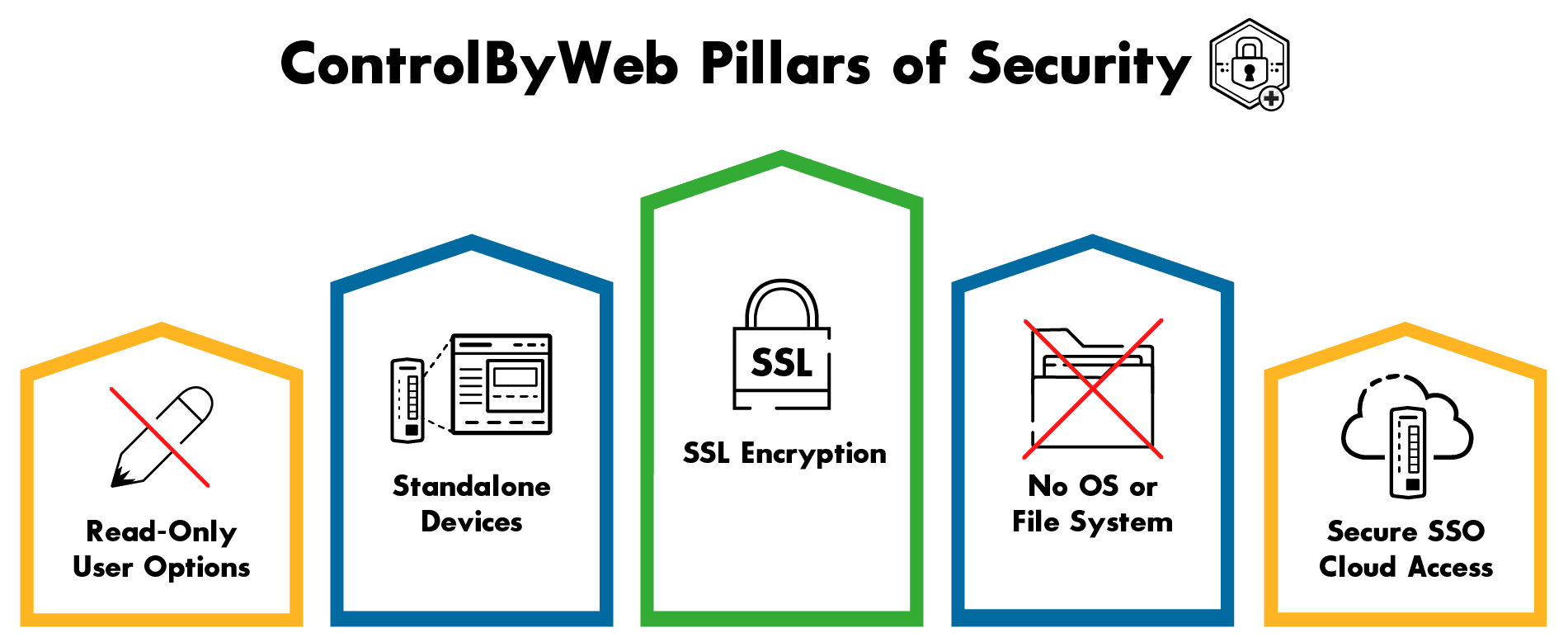 Kaikki ControlByWeb-laitteet tukevat HTTPS:ää ja käyttävät sisäänrakennettuja verkkopalvelimia, jotka vaativat todennusta ja tukevat käyttäjätason käyttöoikeuksia. Laitteet voidaan konfiguroida sallimaan yhteydet vain TLS/SSL-yhteyden kautta, ja palomuurisäännöt rajoittavat pääsyn staattisiin IP-osoitteisiin. Tämä mahdollistaa turvallisen suoran pääsyn ilman lisälaitteistoa tai -ohjelmistoa.