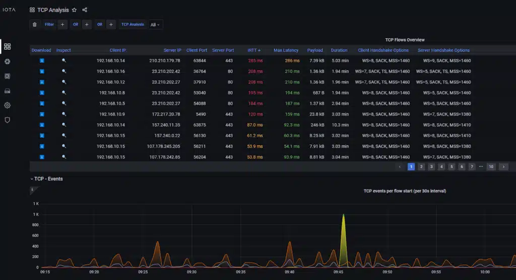 - Latenssianalyysi: Tunnista, onko hitaus peräisin asiakkaasta, palvelimesta vai jostain siirron vaiheesta. Tässä on kuvakaappaus IOTA TCP -analyysin kojelaudasta: